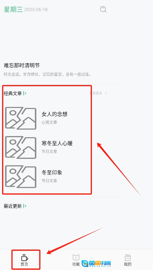 1、打开经典美文美句摘抄大全,一进首页就能看到好多经典文章,超有阅读氛围。
