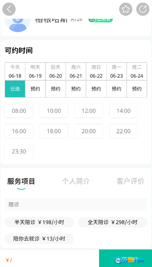 2、选择陪诊师后进入详情页,查看可预约时间段并完成线上预约支付。