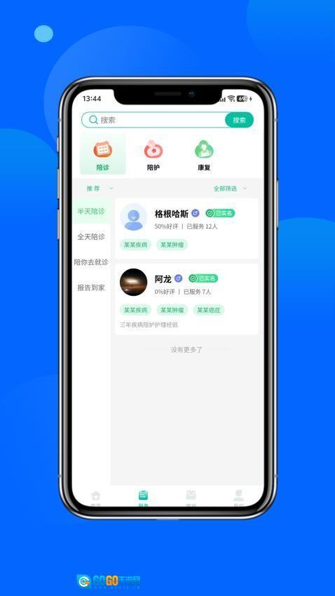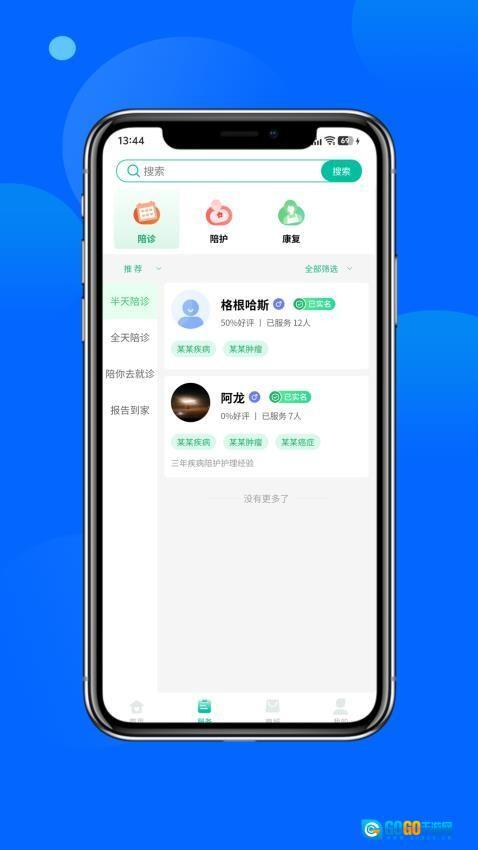 1、启动后,在首页浏览专业陪诊师资料,可根据科室、评分等条件筛选合适人选。