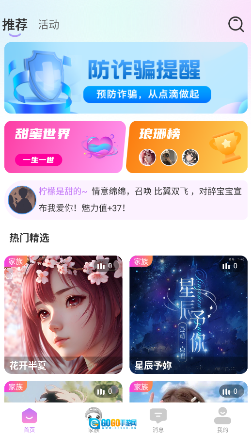 2、进入"家族社区"可创建专属家族群,或通过申请加入其他兴趣家族参与互动。
