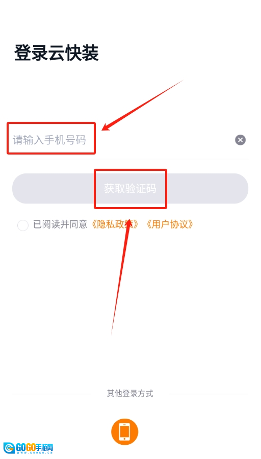 3、同意协议进入主界面,在登录入口处,输入自己的手机号,接着获取验证码,把收到的验证码填好登录 。