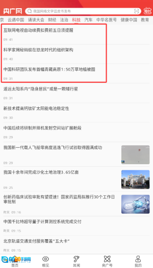 1、启动央广新闻后,在首页导航栏选择"科技"频道,这里每日更新前沿科技动态和行业资讯。