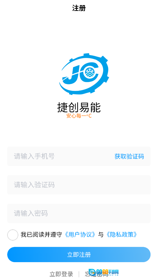 2、填写有效的手机号码并获取短信验证码,设置8-20位包含字母数字的密码后完成注册。