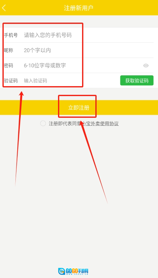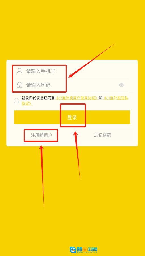 1、首次打开小宝外卖,在登录界面找到对应的输入框,把自己的手机号和设置好的密码填进去,就能登录。
