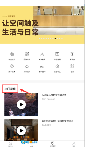 1、启动TOPYS应用后,在首页导航栏选择"创意课堂"栏目,这里汇集优质设计创意课程。