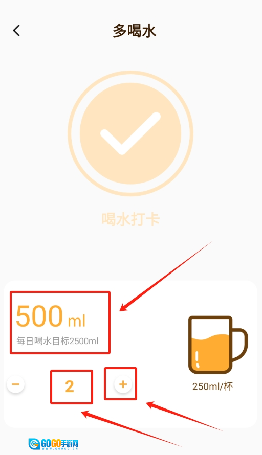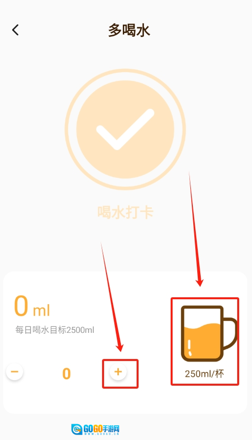 2、软件默认一杯水是 250 毫升,要是喝了一杯,直接点页面上的加号就能添加记录。