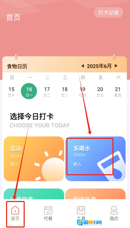 1、打开软件进到首页,一眼就能看到 “多喝水” 的选项,直接点击打开记录页面。