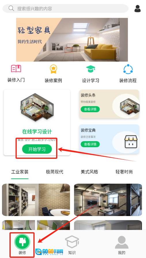 2、进入学习板块,丰富多样的装修设计案例罗列其中,涵盖现代简约、欧式古典等各类风格。