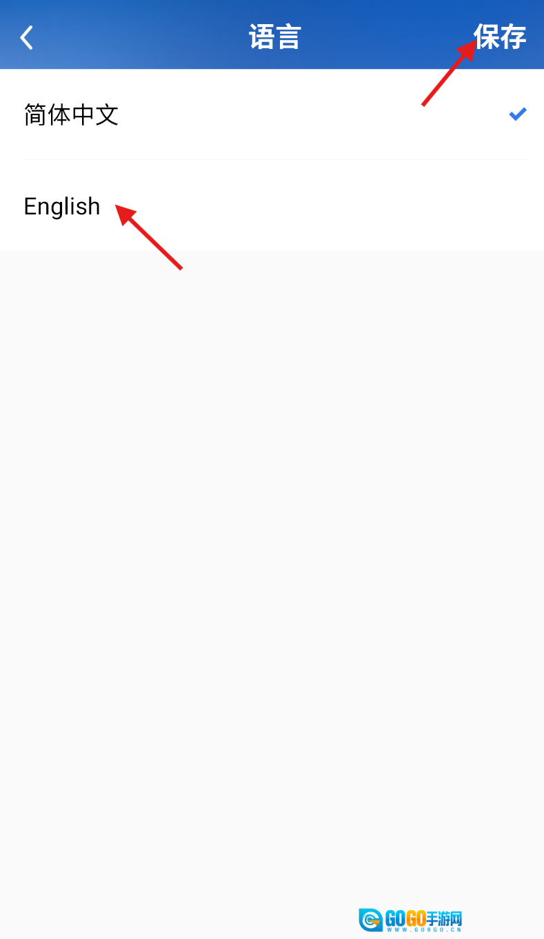 4、在语言选择列表里找到 “English” 选项,点击选定后再点击保存按钮完成切换。