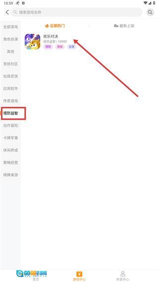 3、进入分类列表后,选择【塔防益智】这一分类,浏览该类别下的游戏(例如《欢乐对决》)。