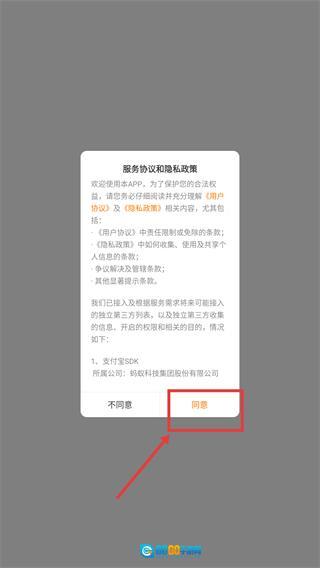 打开应用后,点击【同意】按钮以确认《服务协议和隐私政策》,随后即可进入应用主界面。