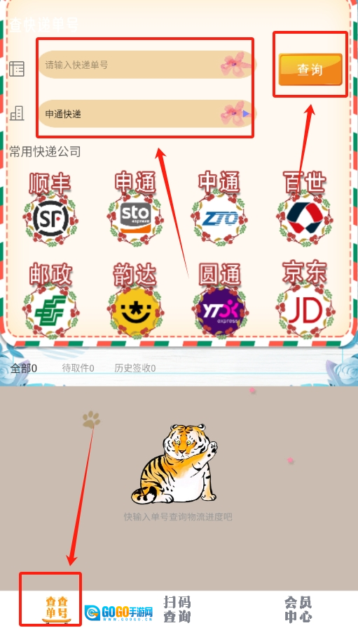 2、登录后回到首页,在查询栏分别输入快递单号和对应的快递公司名称,点击查询按钮,信息马上呈现。