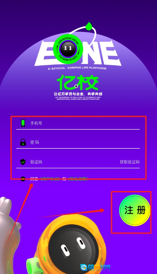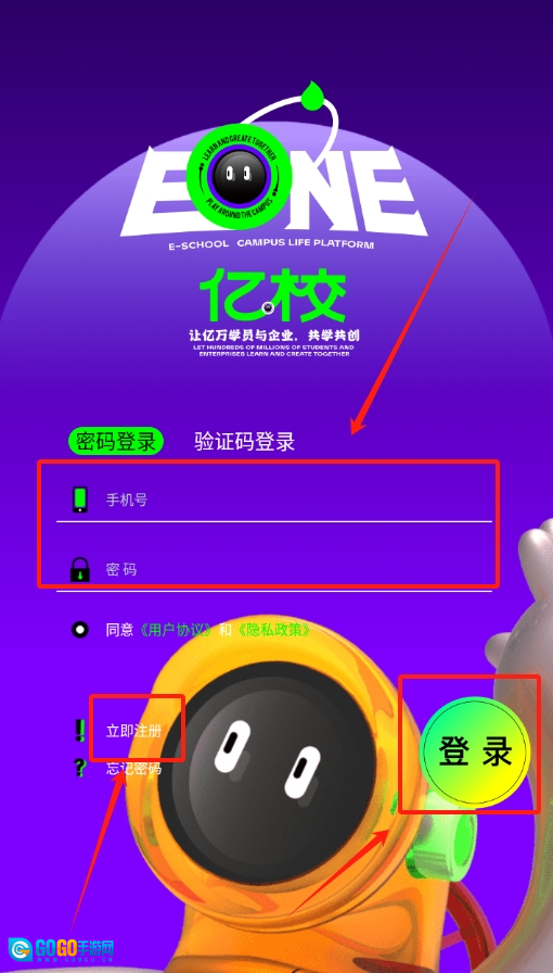 1、打开亿校 ,页面下方有个 “我的” 选项,点进去后在登录栏依次输入手机号和密码。