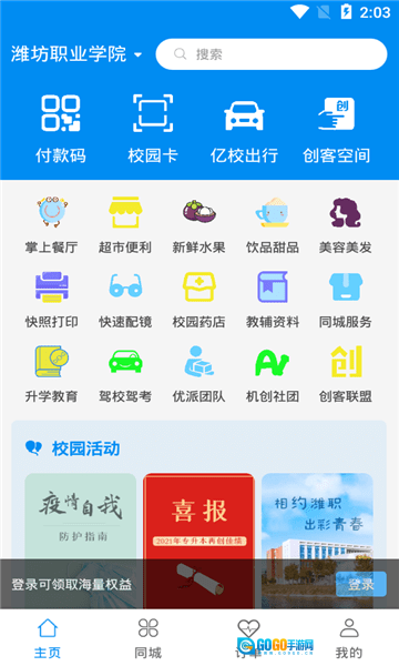 3、成功登录后,自动跳回首页,这里衣食住行、校园活动等服务一目了然,尽情使用就行。