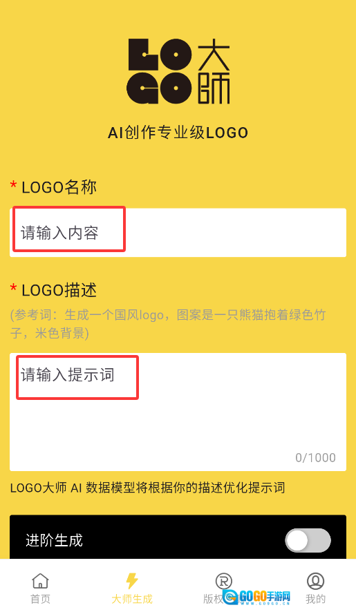 2、在输入框填写品牌名称,并通过关键词描述想要的风格(如:科技感/极简/卡通),系统自动生成设计方案。
