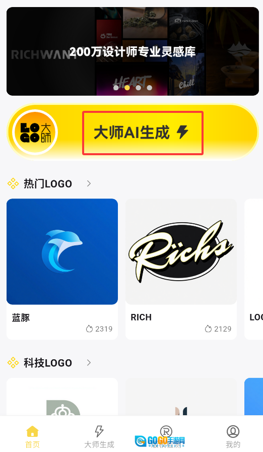 1、启动后,点击首页"AI生成"按钮,进入智能LOGO设计界面。