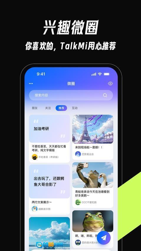 TalkMi这个社交挺方便的,能跟通讯录好友随时聊天。重要朋友可以特别关注,动态消息不会错过。建群聊、私聊都支持,分享日常也很简单。如果你想跟朋友保持联系的,用这个挺合适。操作不复杂,用着顺手,赶紧一个试试吧。
