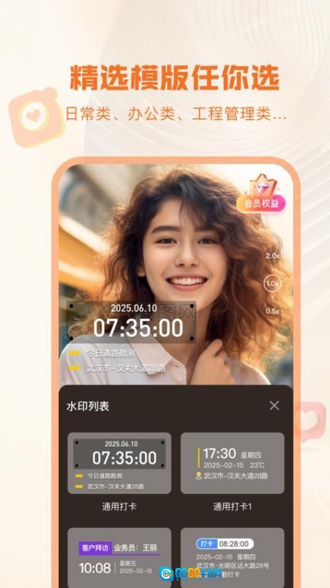 1、动态信息水印。实时嵌入GPS定位、天气数据、时间戳等15种信息,水印内容随拍摄环境自动更新。