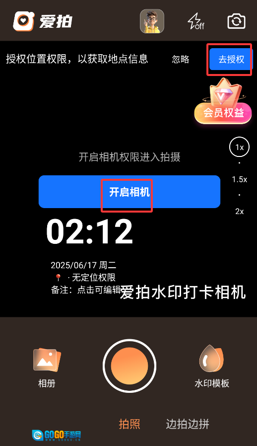 1、启动后,点击拍摄按钮会自动提示开启相机和定位权限,确保水印信息完整显示。