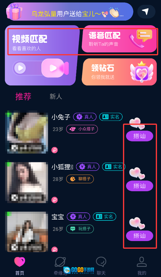 2、在匹配页面上滑查看完整资料,下滑切换推荐对象,左滑收藏心动用户,右滑发起聊天。