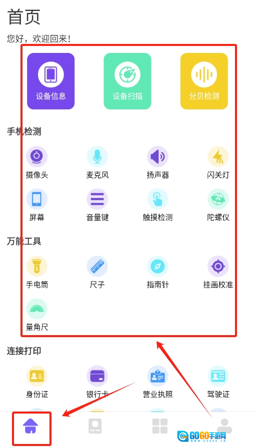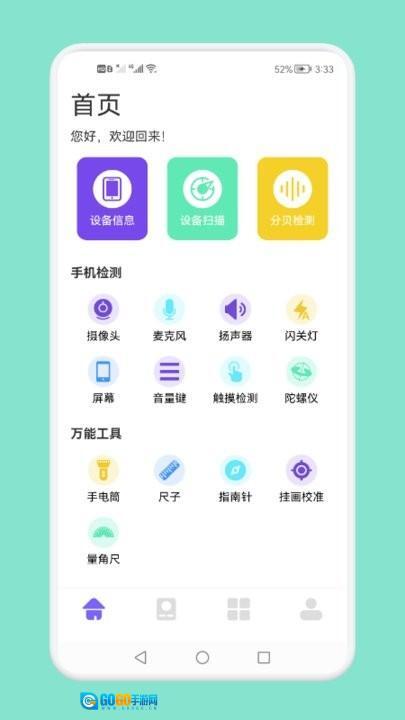 1、打开软件后,首页会显示很多实用功能,像分贝仪、屏幕测试等都能直接使用。