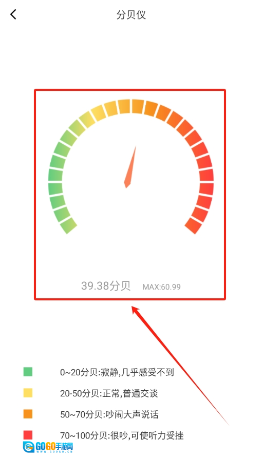 2、其中分贝仪功能很直观,点击就能进入界面,实时检测周围环境的声音分贝数。