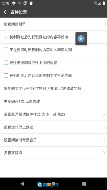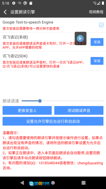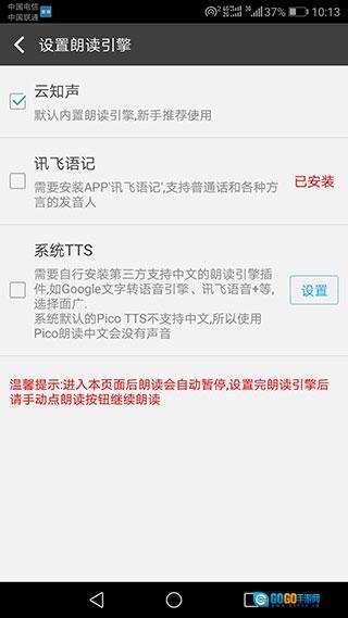 4、在设置界面里,您也能挑选朗读引擎;文字朗读神器兼容多种朗读引擎,像云知声、讯飞语记以及系统TTS都包含在内;不同引擎各有其专属的特性与长处,您可依据自身的需求来选定适宜的引擎;
