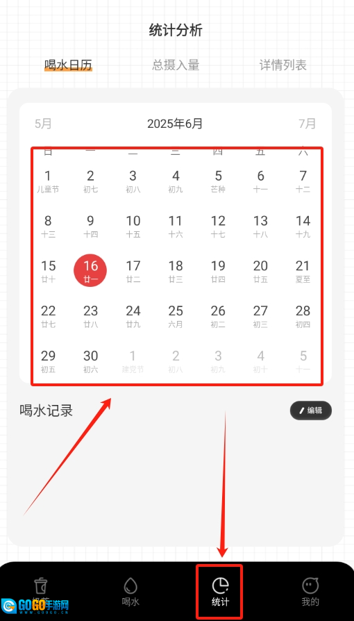 3、进入统计页面,跟着日历翻一翻,就能查看每天的喝水记录,掌握饮水情况。
