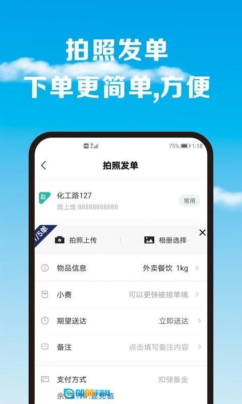 1、打开拎达快送,在首页清晰选择配送、帮取等对应服务类型,详细填写物品信息和地址完成下单。
