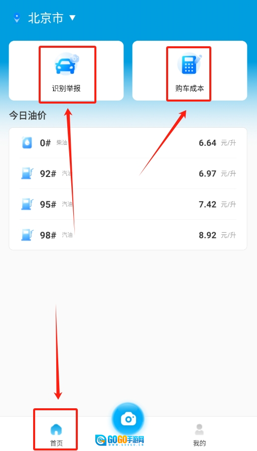 1、打开交通拍客软件,映入眼帘的首页上,识别举报与购车成本计算功能板块清晰可见。