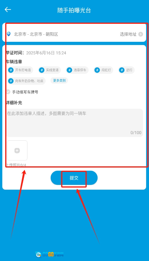 2、若要举报违章,在对应区域填好地址、描述违章事件,再上传清晰照片,无误后点击提交。