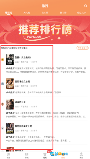 2、浏览榜单时找到"推荐"专区,这里精选了平台优质作品,点击心仪的小说封面即可。