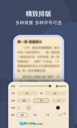 3、阅读设置提供20余种背景主题,支持字号、间距等细节调整。夜间模式采用专业护眼色温。