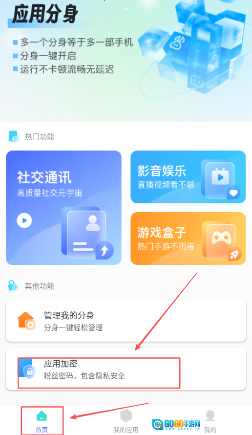 2、完成登录操作后,系统自动跳转至软件首页,在首页的功能模块中找到标注着应用加密的选项,点击进入应用加密的设置界面。