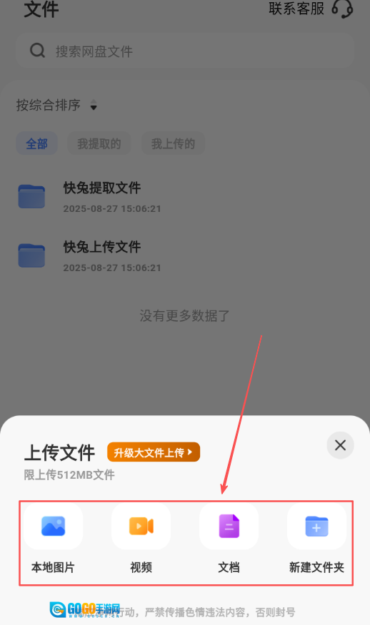 1、上传文件时,打开快兔网盘 ,找到上传按钮,选择需要上传的文件或文件夹,确认后等待上传完成,文件就会保存到云盘。