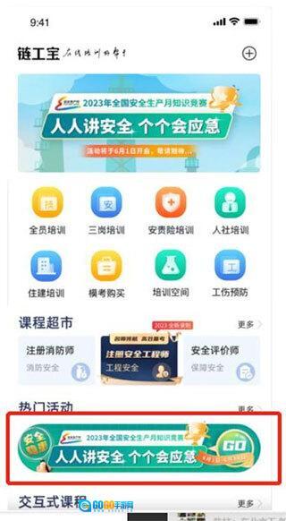 2、打开后,在首页点击“2023年全国安全生产月知识竞赛”的胶囊样式图片(具体样式可参考下方图示),随后进入报名环节,该环节共包含三个步骤: