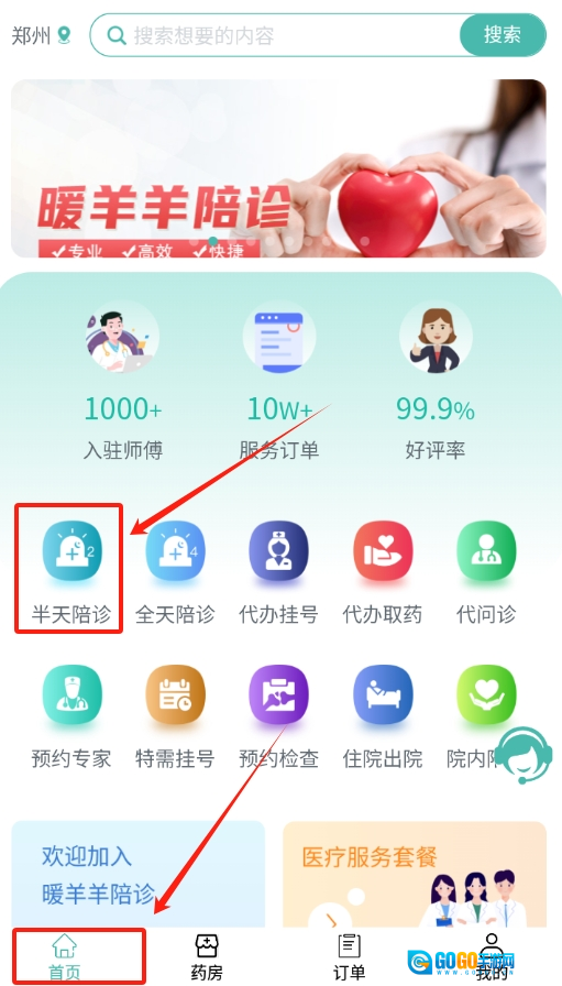 1、安装后打开,注册账号并登录,在首页点击陪诊下单,填写就诊人信息和医院等内容。