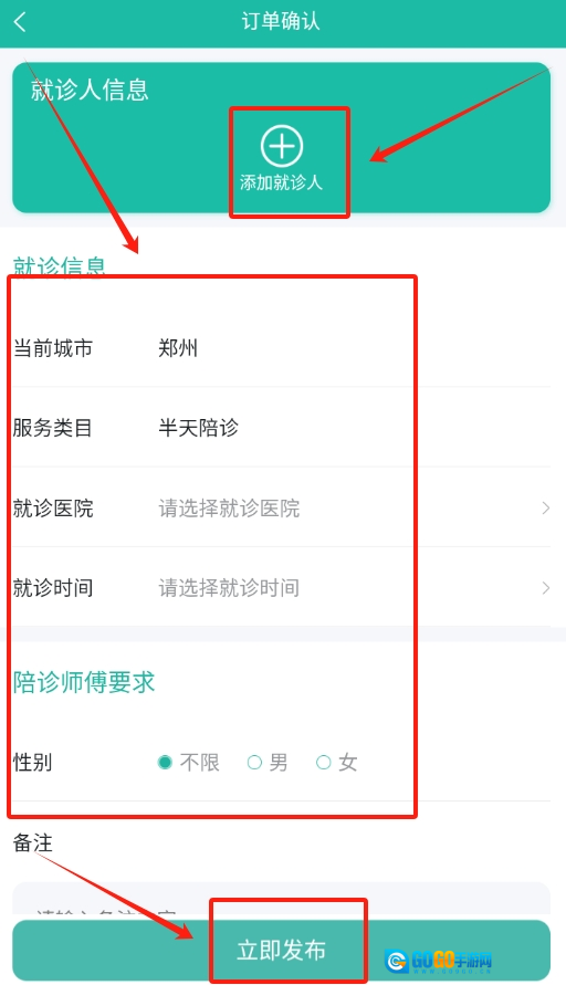 4、然后添加就诊人的信息,再把就诊的具体信息和对陪诊师傅的要求输进去,输完点击立即发布就可以了。
