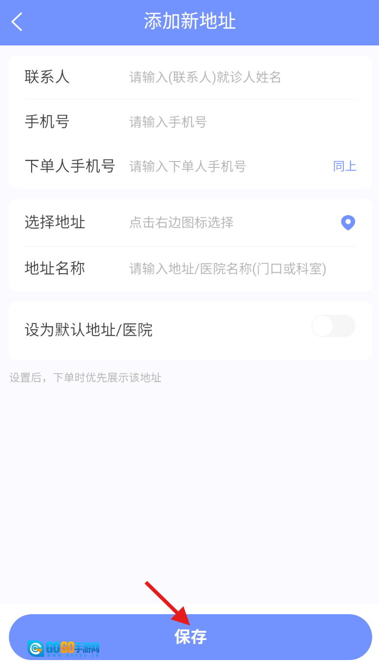 4、在填写页面输入具体的地址信息,确认信息无误后,点击页面中的保存按钮即可。