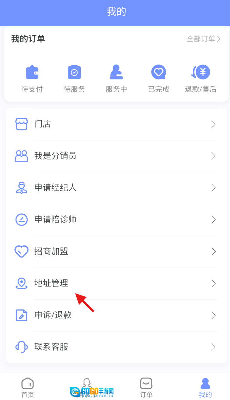 2、进入 “我的” 页面后,在显示的功能选项里找到 “地址管理”,点击进入地址相关的设置界面。
