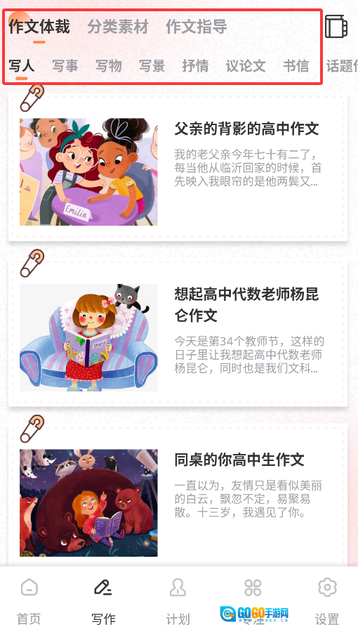 3、写作板块包含多种作文体裁、分类素材和写作指导等实用内容。