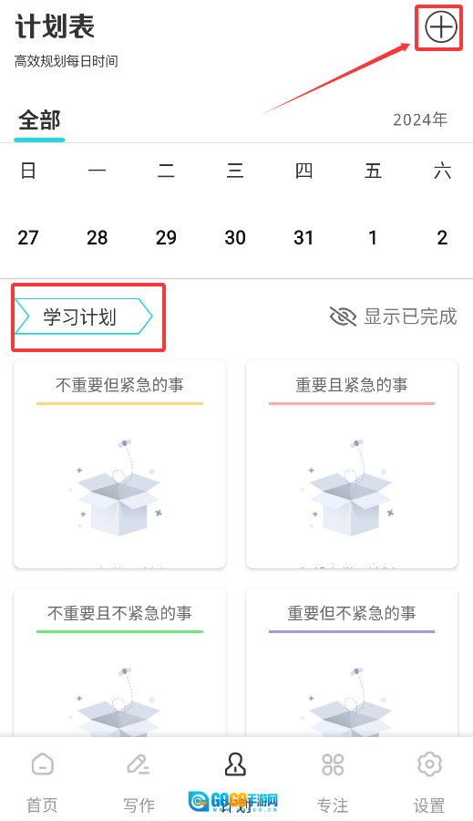 4、计划页面可查看学习进度,点击右上角"+"号即可创建新的学习计划。
