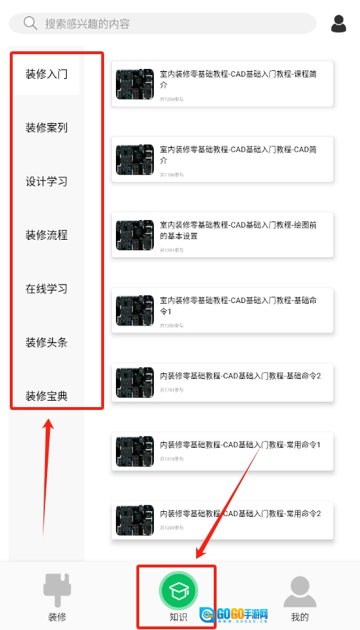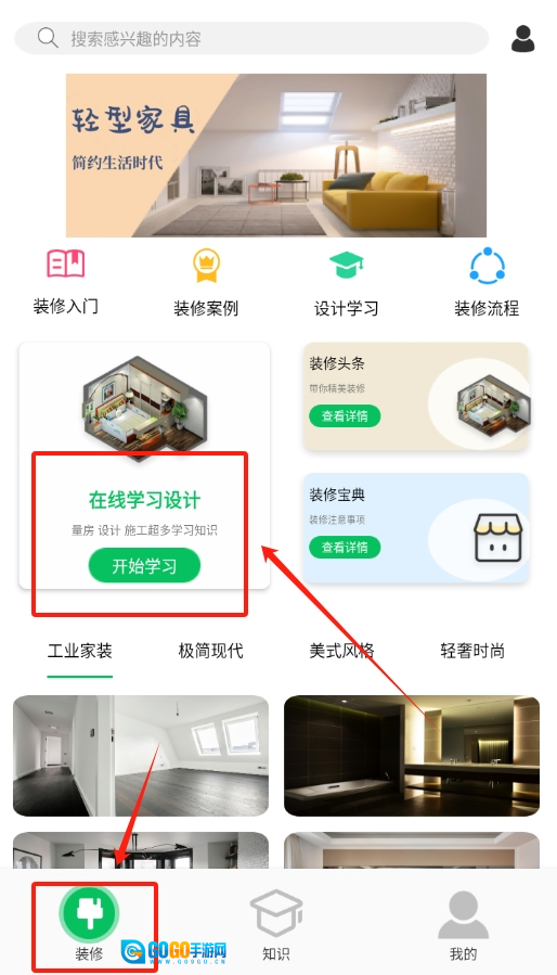 4、学习完案例视频后,可前往知识页面,里面有更多关于装修材料、风格搭配等方面的知识内容。