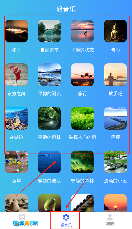 4、在首页找到轻音乐页面入口并点击进入,该页面有很多适合睡前听的音乐,选择喜欢的音乐播放助眠。