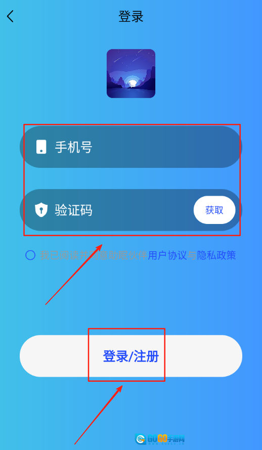 2、跳转至登录界面后,在指定输入框中填写自己的手机号,获取验证码后输入,完成账号登录操作。
