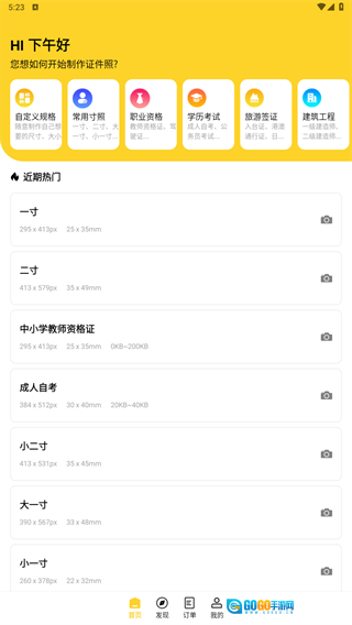 2、进入首页,查看展示的证件照类型和热门的尺寸