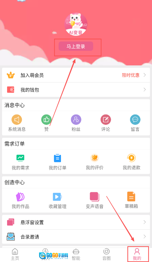 1、打开萌我语音包后,在界面中找到我的页面入口,点击进入我的页面,在该页面里找到登录选项并点击,准备进入登录环节。