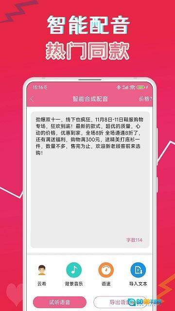 4、具备广告配音功能,采用人工智能技术进行配音,提供超过 70 种音色主播选择,能让地摊叫卖等广告配音更有吸引力。