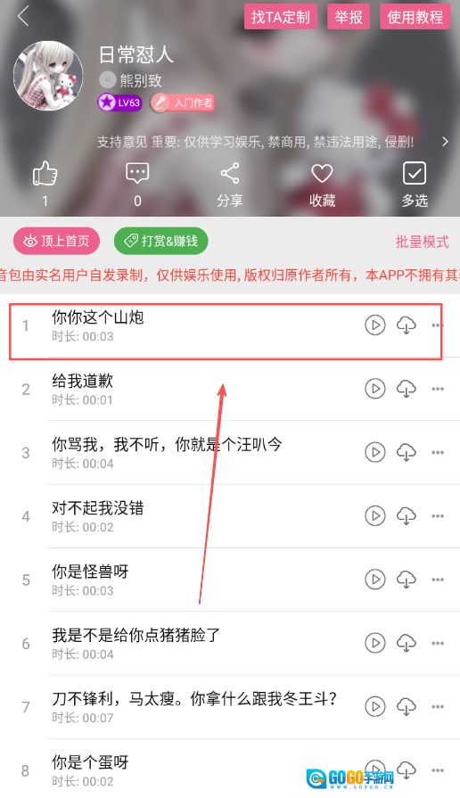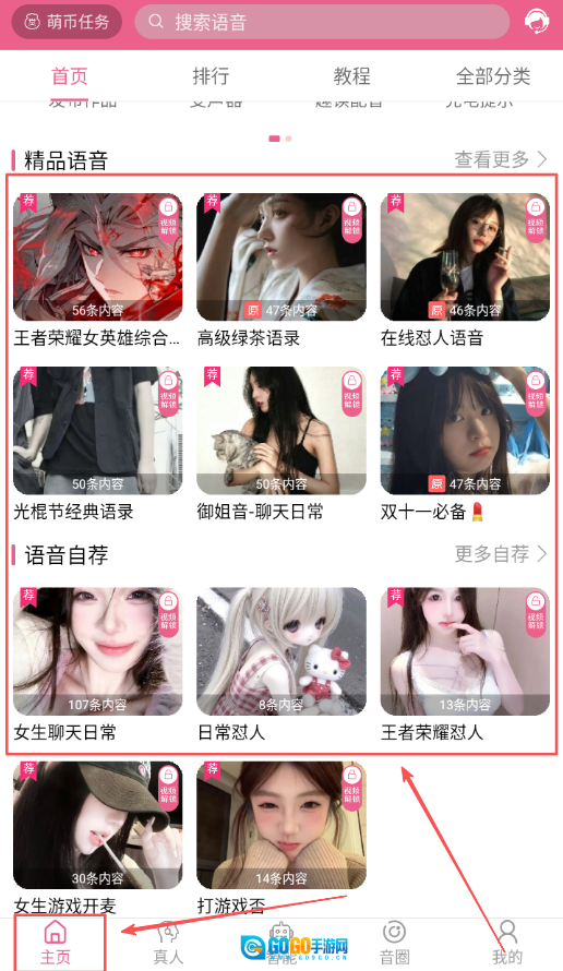 3、登录账号后,系统会自动跳转回软件首页,在首页的语音包分类中挑选一种自己喜欢风格的语音包,点击该语音包进入详情页。