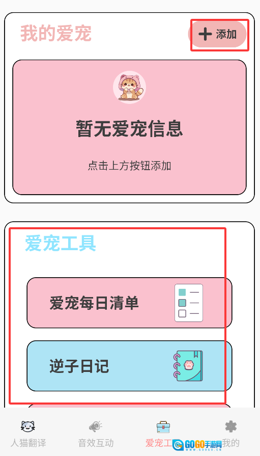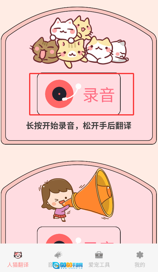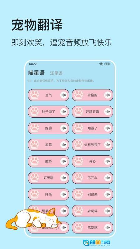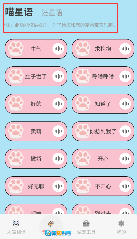 3、趣味互动专区提供猫语和狗语模拟功能,可播放不同情绪的动物叫声与宠物交流。